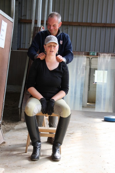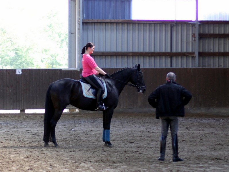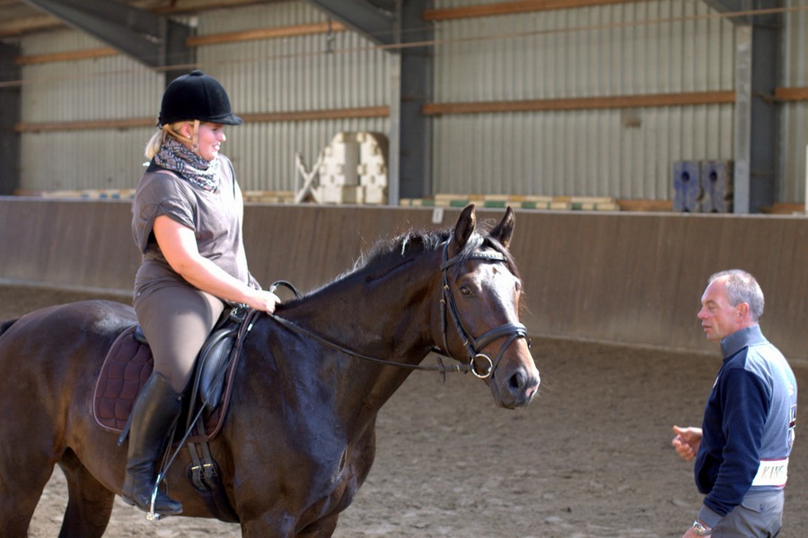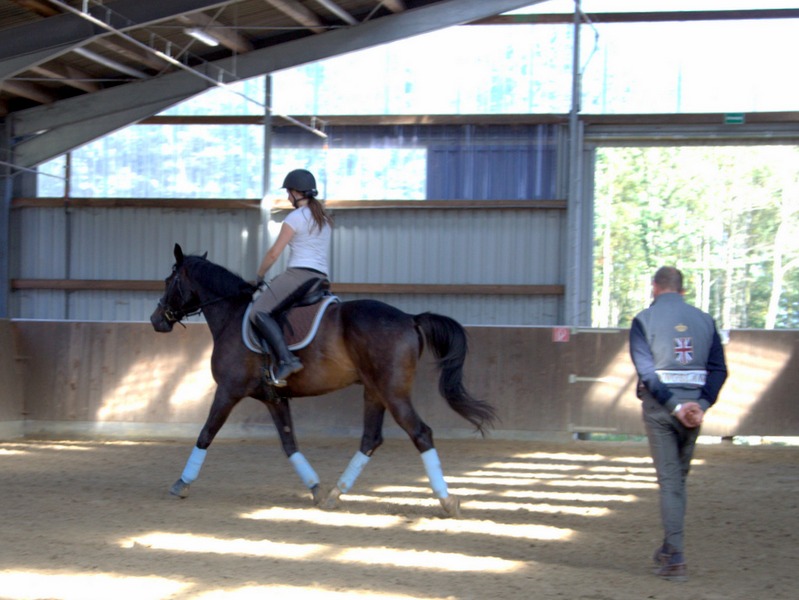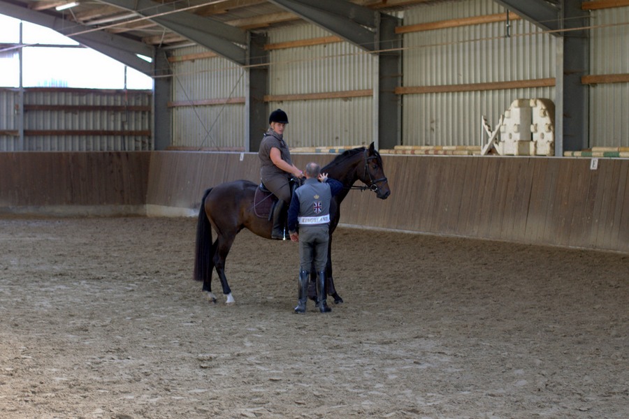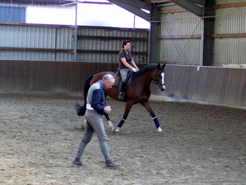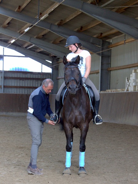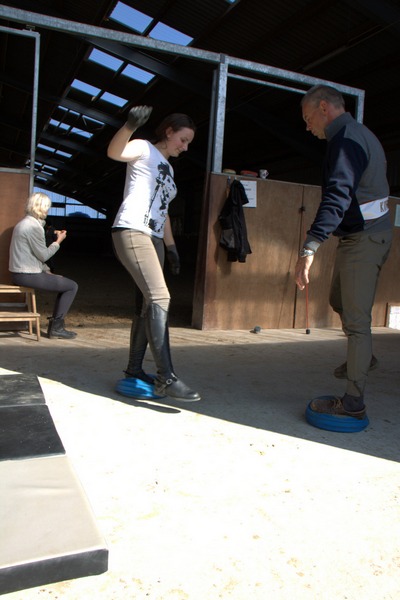 Anschliessend arbeitete Grebe mit Hilfe des genau abgestimmten Bewegungstrainings ersteinmal am Boden gezielt an diesen Schwächen. Dann ging es für die Reiter wieder zurück auf ihr Pferd, wo Rolf Grebe überprüfte, ob die angewandten Maßnahmen Wirkung zeigten. In mehreren dieser Durchläufe wurde so am Sitz und am Bewegungapparat von Reiter und Pferd gearbeitet.