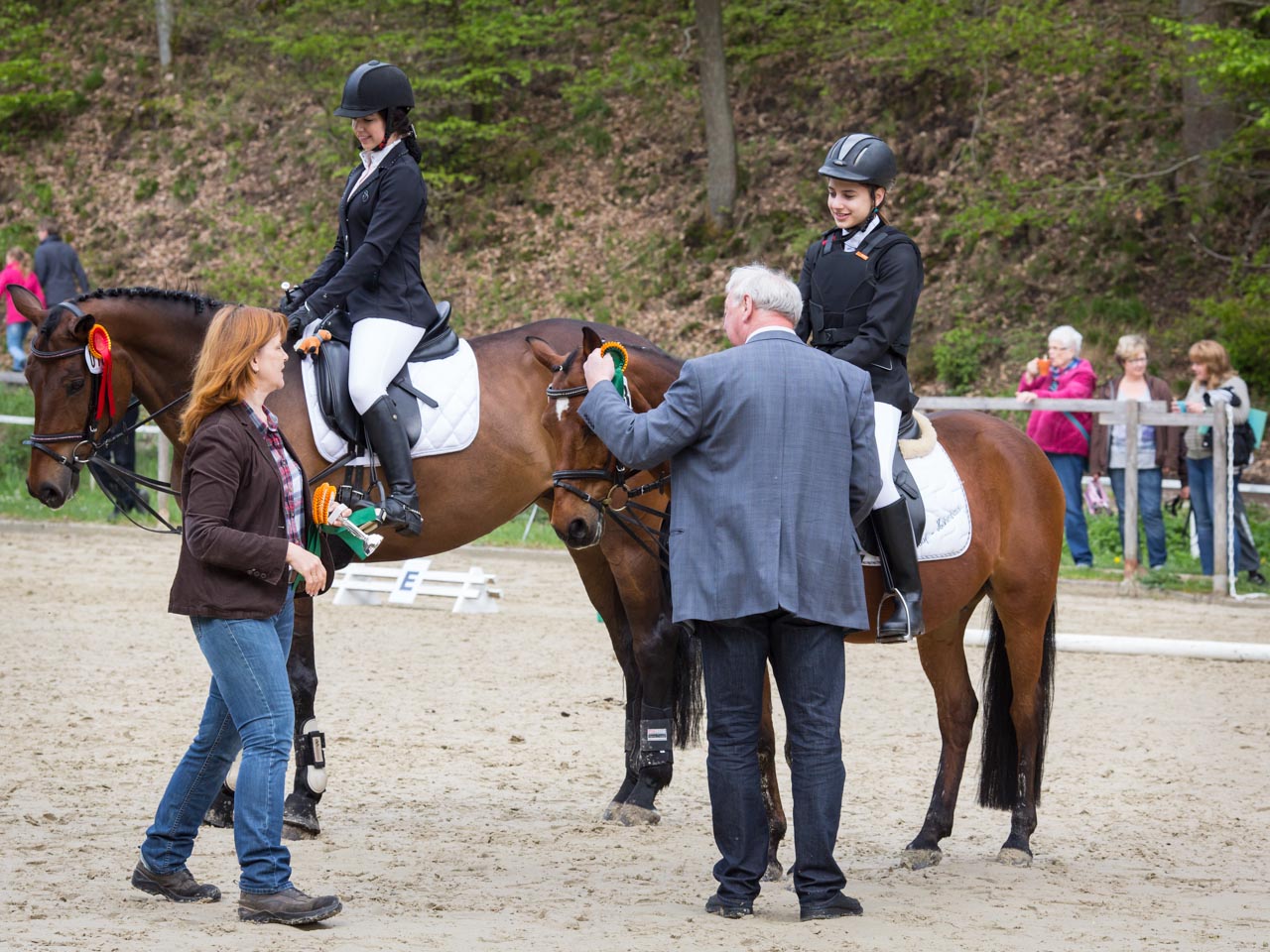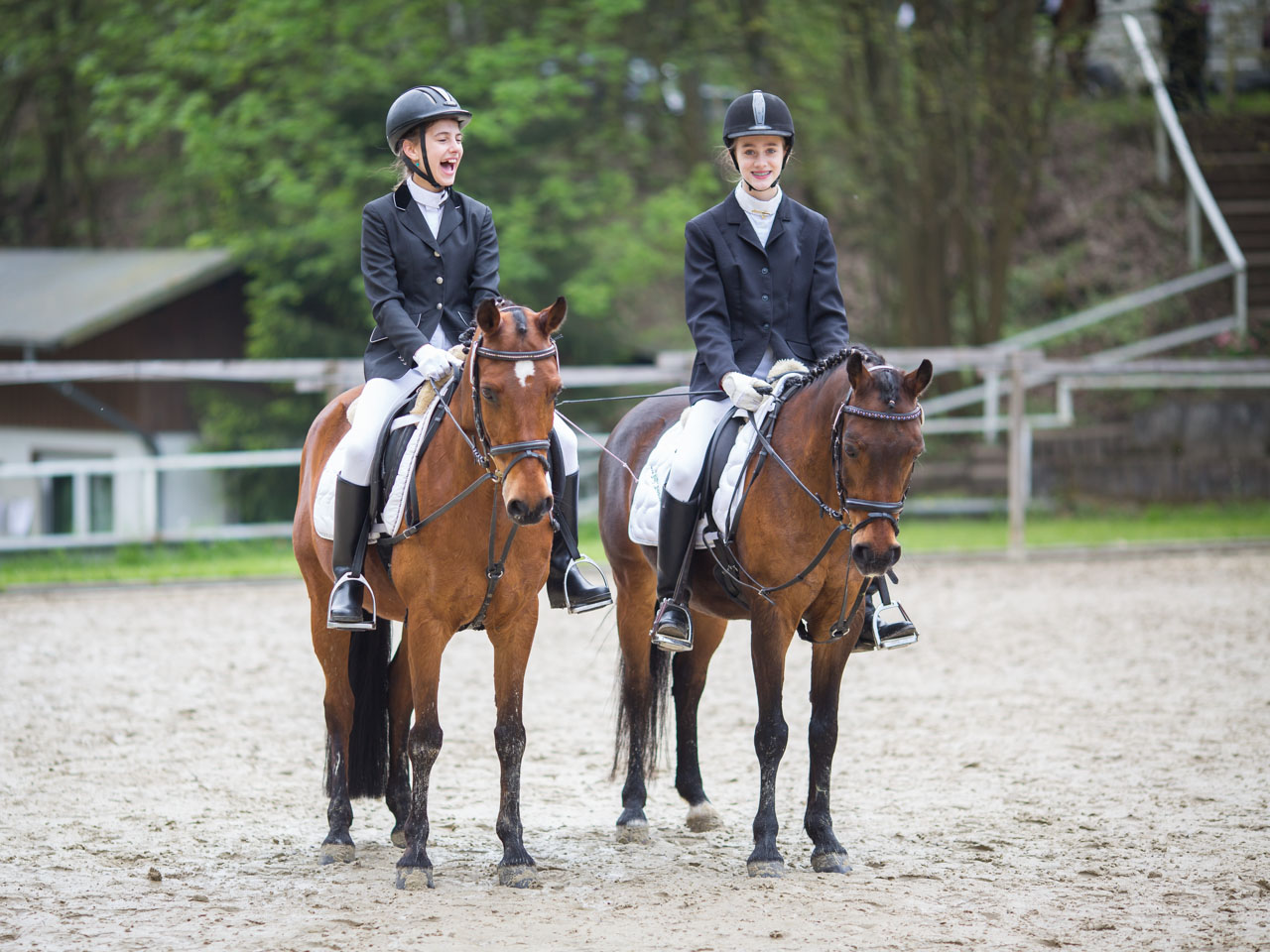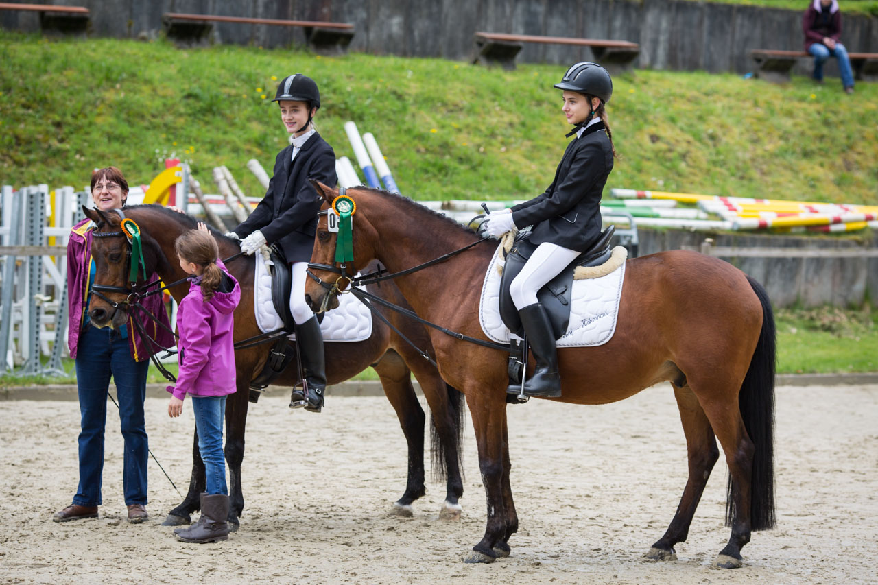 Das erste Turnier wurde mittlerweile erfolgreich absolviert – am 01.05.2014 starteten Carlotta und Marina mit Dodo und Pinsel in den Prüfungen „Dressurreiter-WB Hufschlagfiguren“ und „Reiter-WB Schritt – Trab – Galopp“ in Siegen. Und siehe da: In der ersten Prüfung platzierten sich beide mit den tollen Noten 7,1 (Carlotta/Dodo) und 6,9 (Marina/Pinsel). In der zweiten Prüfung konnten sich beide mit den Noten 7,1 (Marina/Pinsel) und 6,9 (Carlotta/Dodo) sogar die Plätze 2 und 4 sichern.