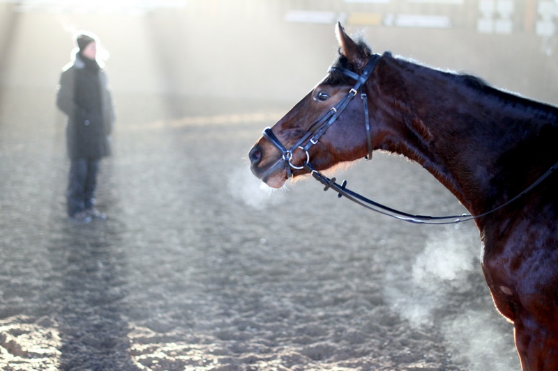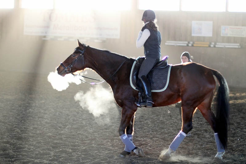 Teilnehmer der RG-HH waren Heike mit Fairytopia und Trainerin Christine mit Es’da. Alles gut verstaut ging es frühzeitig nach Schmallenberg-Felbecke. Vielleicht etwas zu früh angekommen, konnten wir uns schon vor Beginn der Stunde ein Bild vom Ablauf machen. Eines war schnell klar: Monika Theodorescu hatte es bei der Kälte nicht einfach. Da ging es Reiter und Pferd dank der Bewegung schon etwas besser.