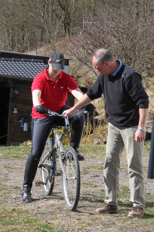 Zunächst zeigte sich jede Reiterin mit ihrem Pferd in den Gangarten Schritt, Trab und Galopp, so dass sich Herr Grebe einen ersten Eindruck verschaffen konnte. Danach stieg man vom Pferd ab und absolvierte genau auf das beobachtete Defizit abgestimmte Bewegungsübungen. Diese wurden z.B. auf Matten, dem berühmten „Balimo-Hocker“ oder dem sogenannten „Snaix-Fahrrad“ durchgeführt. Danach stieg man wieder aufs Pferd und die Ergebnisse waren einfach überwältigend.