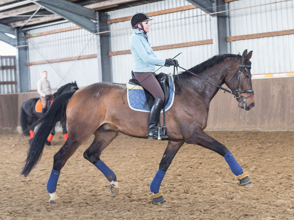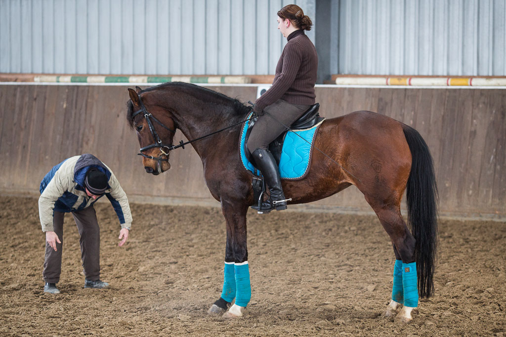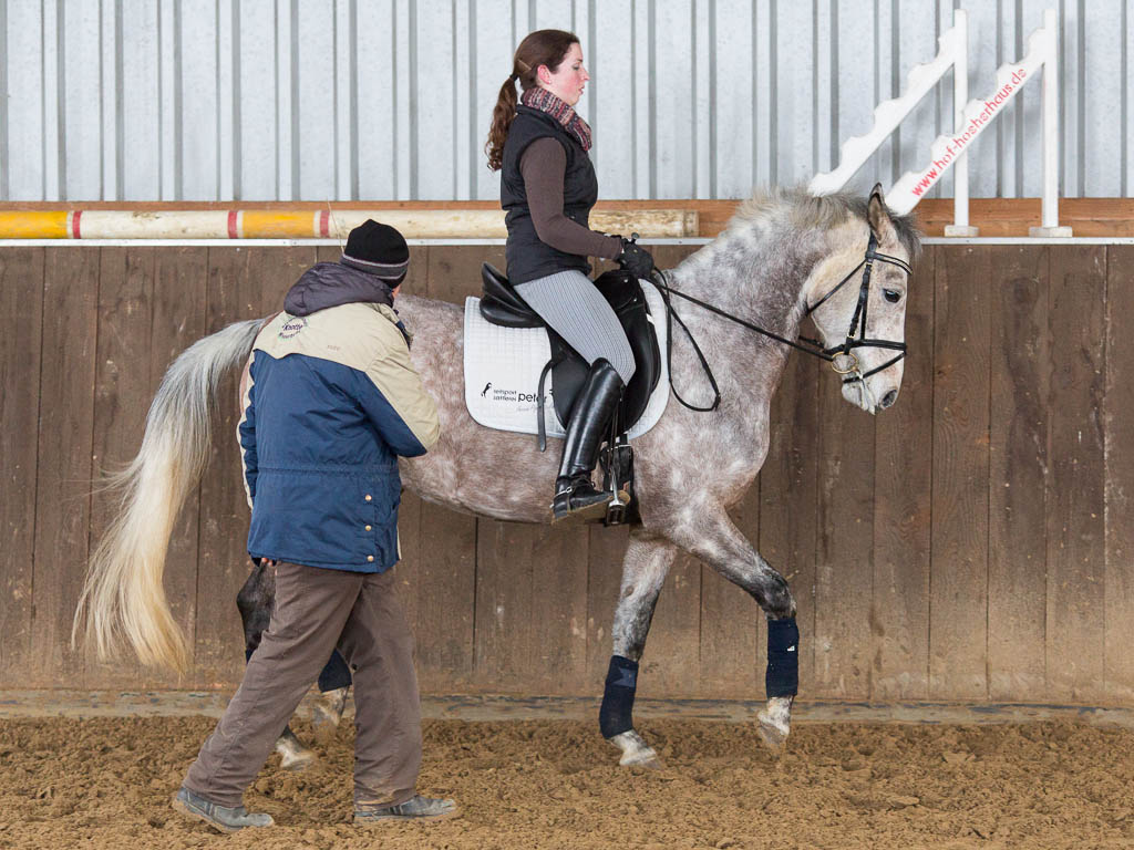 Auf der heutigen Tagesordnung standen neben mehreren Dressurtrainings auch zwei Sitzschulungen. Die Sitzschulungen von Herrn Grebe sind ja bereits seit einiger Zeit ein fester Bestandteil der Ausbildung auf Hof-Höherhaus. Und das nicht ohne Grund, denn oft sind selbst kleine Haltungsprobleme und die daraus resultierenden Folgen Ursache für Schwierigkeiten beim Ritt. Wie gut die Kommunikation mit dem Pferd funktioniert und wie locker man im Sattel sitzt, wird oft erst klar, nachdem man eine solche Sitzschulung absolviert hat. Oft konnte Rolf Grebe bereits helfen und hier und da erzeugten die Korrekturen sogar den oft beschriebenen „Wow-Effekt“.