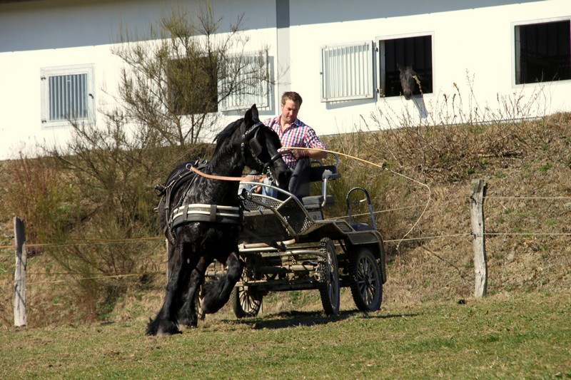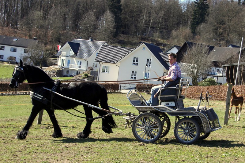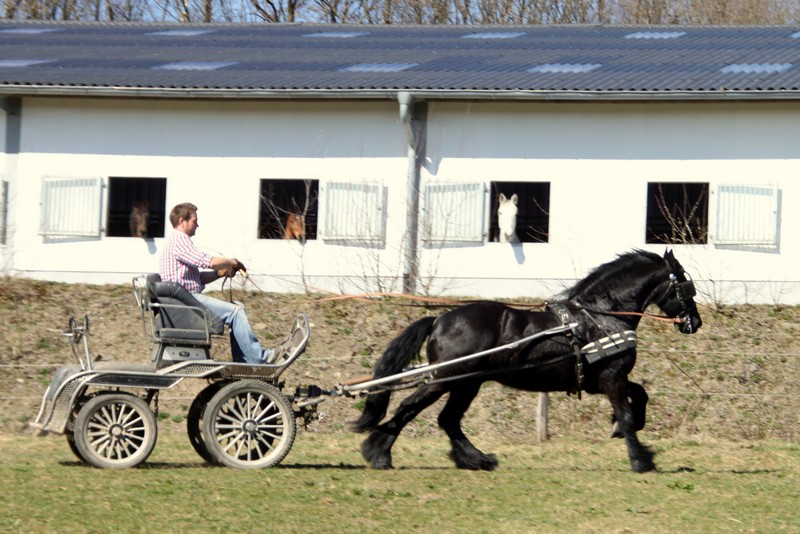 Der Ort Essinghausen hat vermutlich mehr Pferde als Einwohner. So ist es nichts Ungewöhnliches, viele Reiterinnen und Reiter hoch zu Pferd zu beobachten, die die ersten Sonnenstrahlen nutzen, um einen schönen Ausritt ins Gelände zu unternehmen. Doch auf Hof Höherhaus gibt es eine Ausnahme: Thomas mit seinem Friesenwallach Klaas, der einspännig gefahren wird.