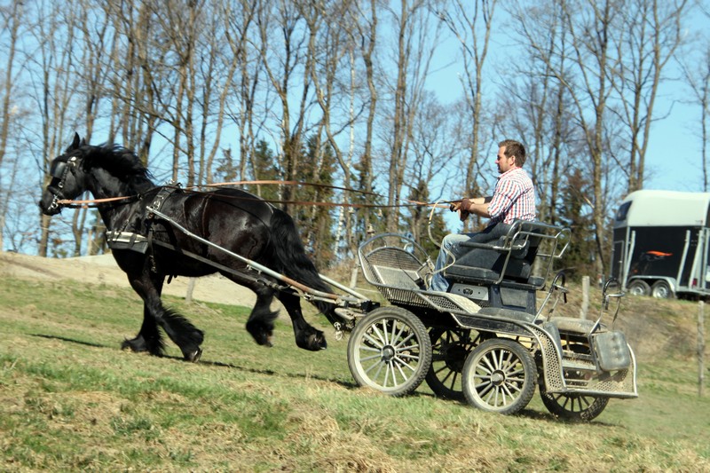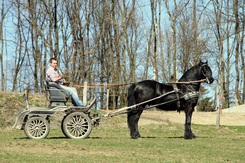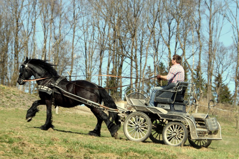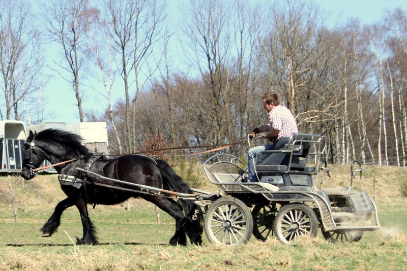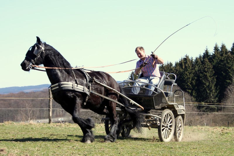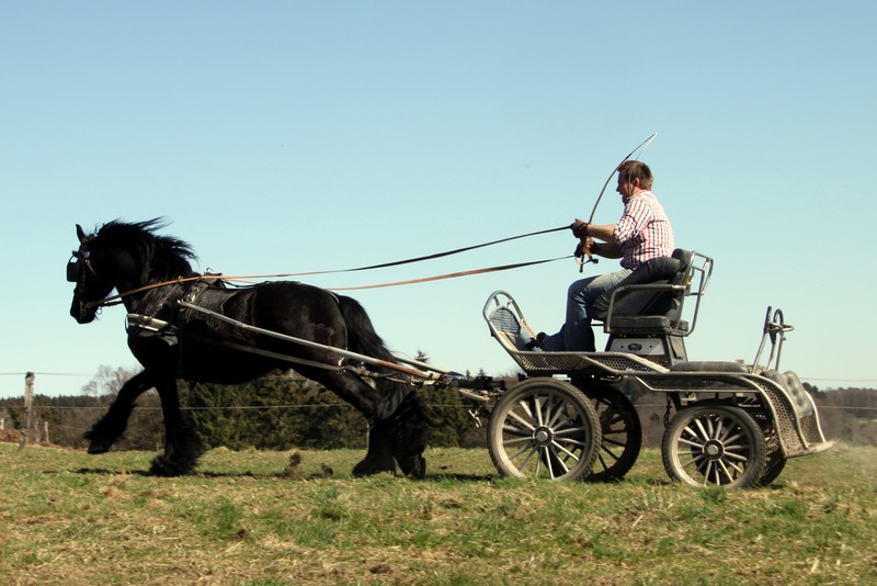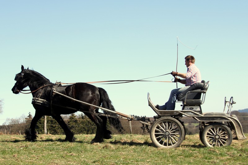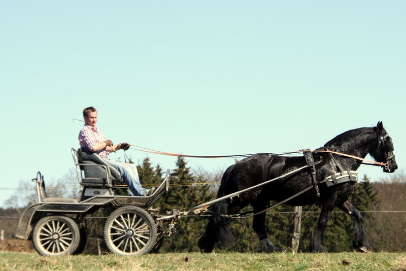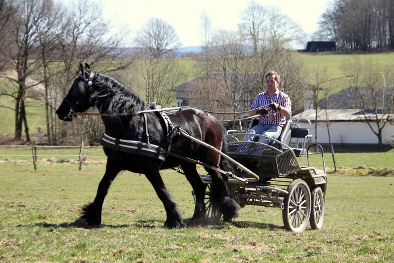 Klaas ist ein aus Holland stammender Friese, der auf einem Friesengestüt am Bodensee im Fahren ausgebildet wurde. Sei es ein-, zwei-, vier- oder achtspännig, der arbeitswillige Wallach hat schon alles mitgemacht! Hier in den Sauerländer Wäldern wird er mit einem Marathonwagen gefahren. Dabei handelt es sich um eine Kutsche mit einem sehr wendigen und robusten Fahrwerk, die vorwiegend zum Training und Fahrsportwettbewerben eingesetzt wird.