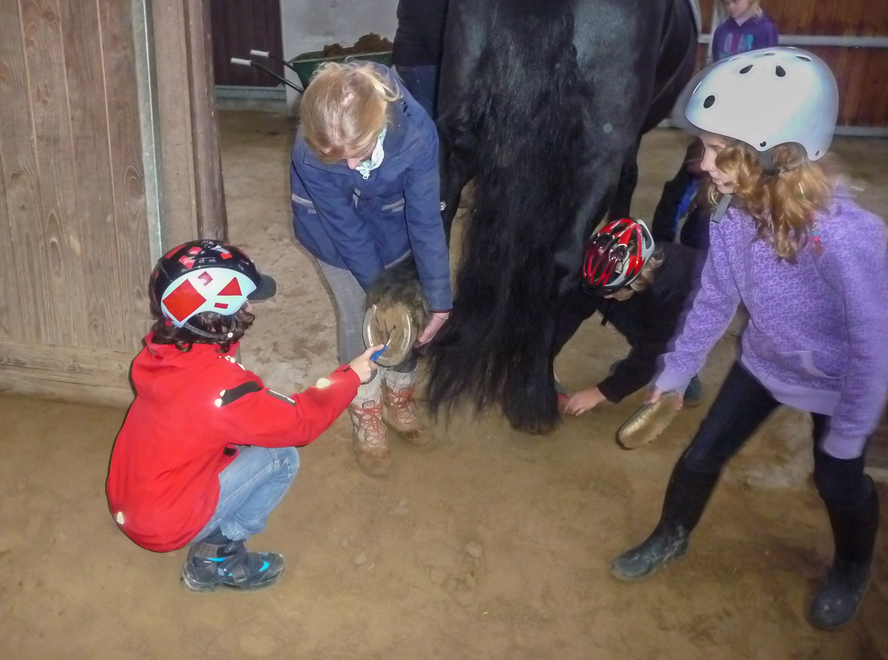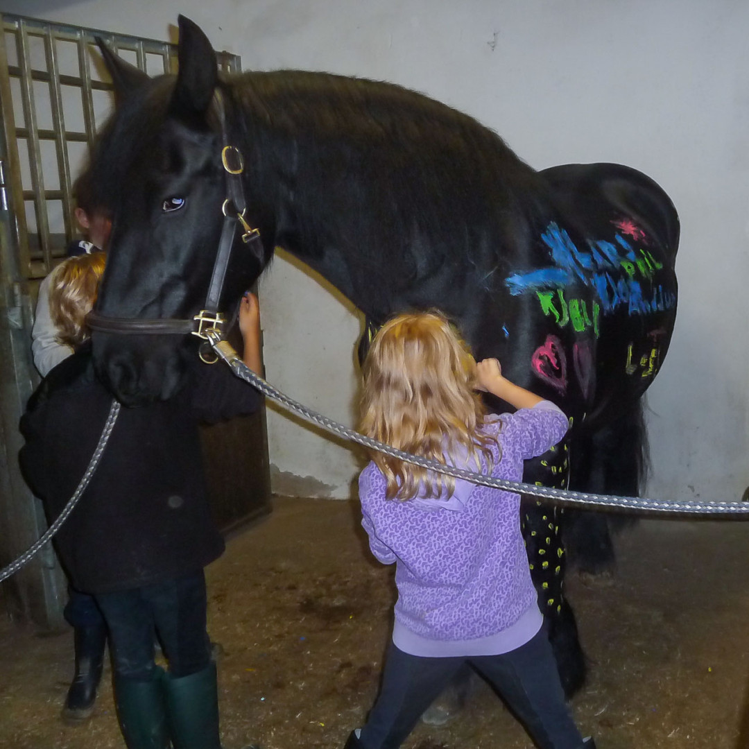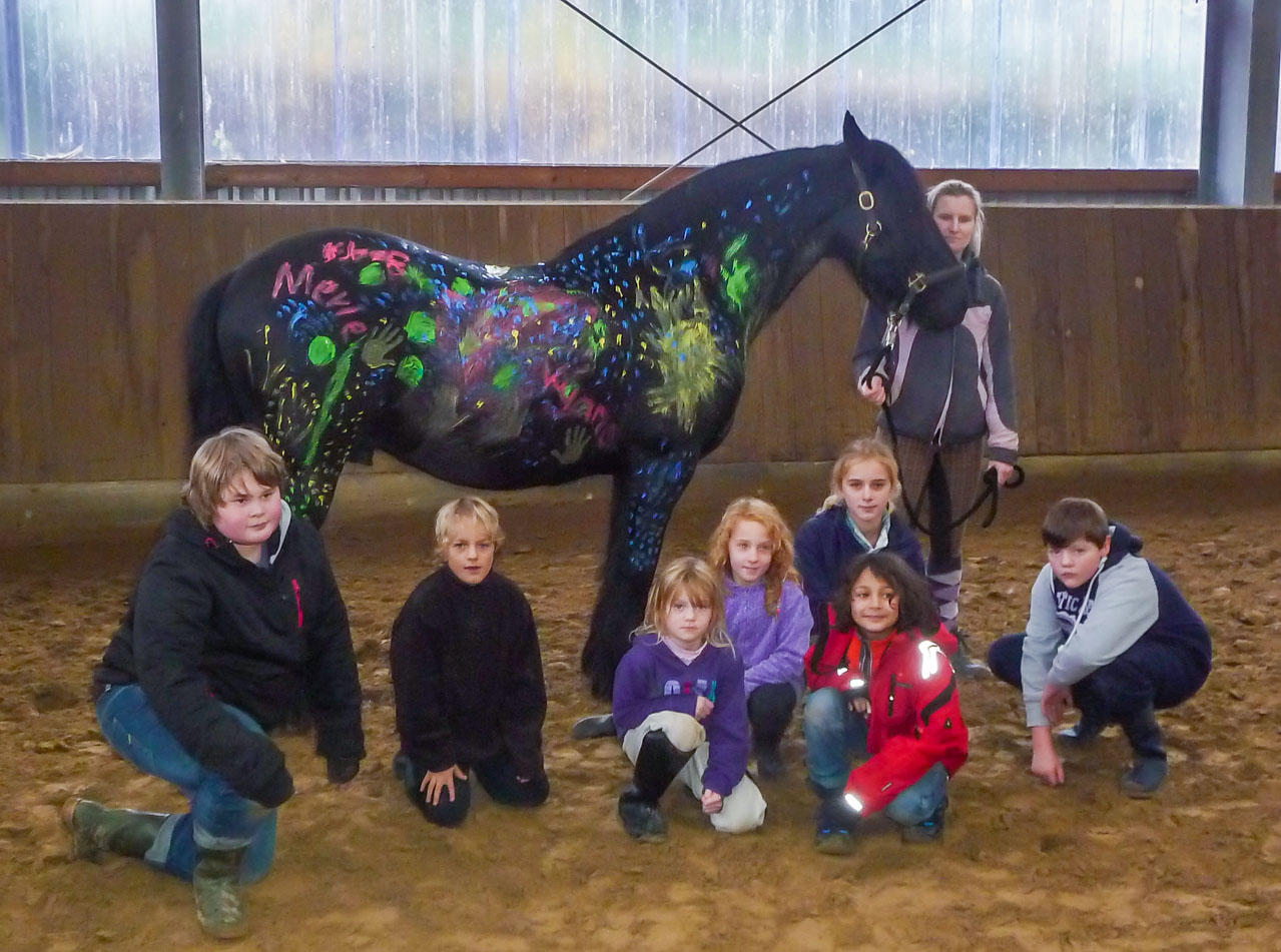 Doch auch die Theorie durfte nicht fehlen: Fütterung, Farbenkunde oder das Bestimmen einzelner Körperteile sind nur einige Beispiele der Theorieeinheiten, die immer mit praktischen Elementen verknüpft wurden. Am letzten Tag des Projektes durften die Kinder sogar mit Fingermalfarbe ihre Namen auf den Friesenwallach schreiben und sich mit bunten Bildern verewigen.