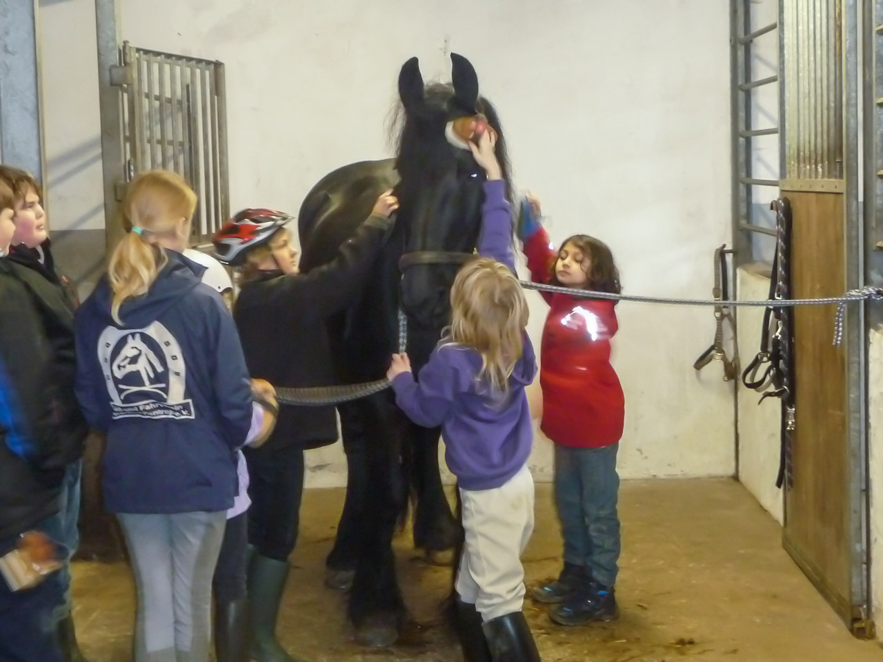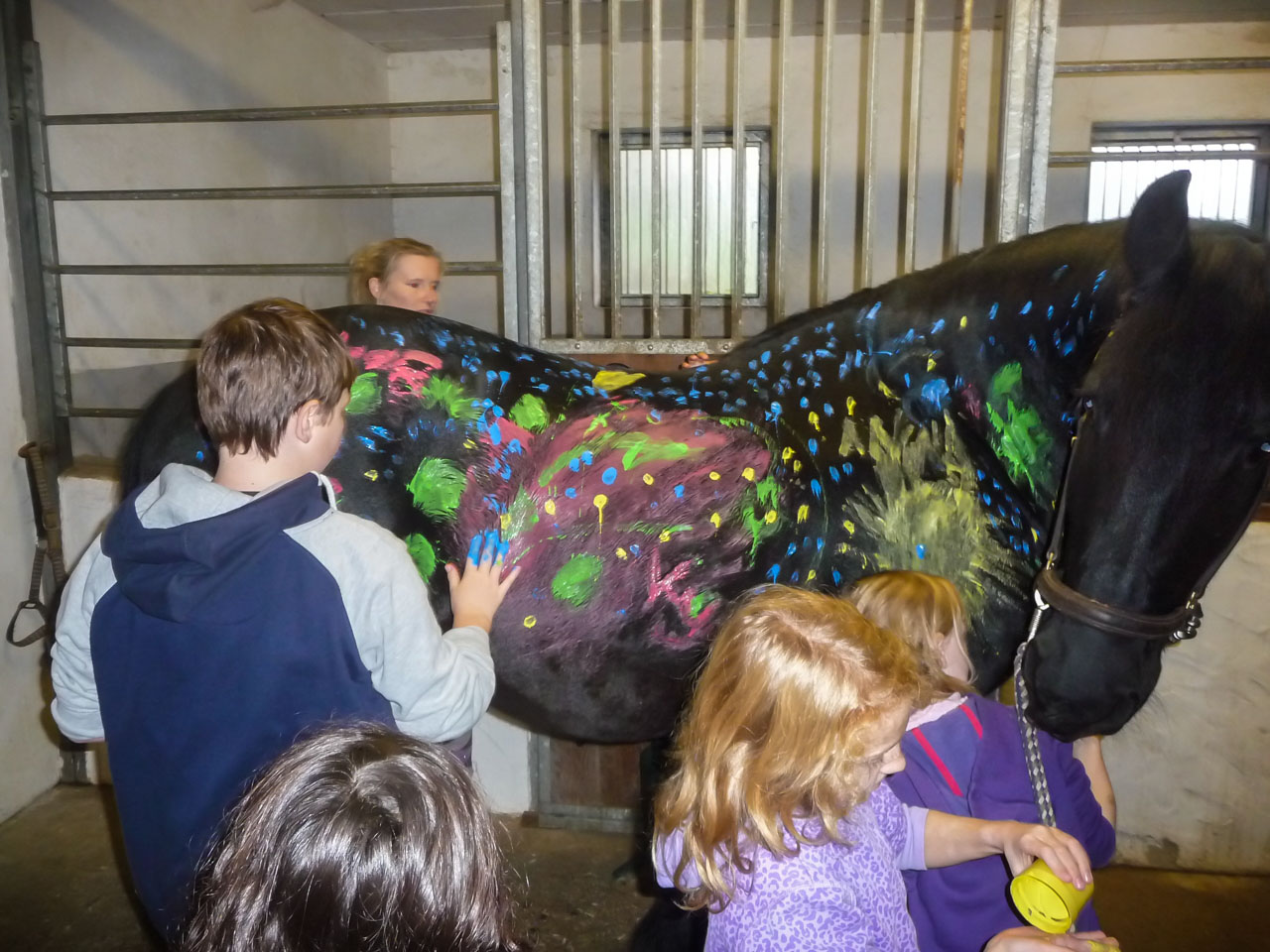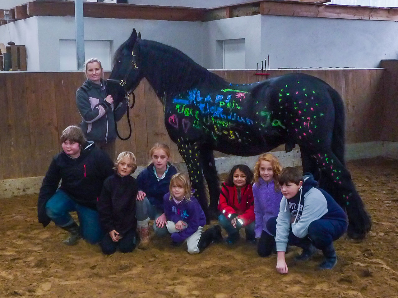 Doch auch die Theorie durfte nicht fehlen: Fütterung, Farbenkunde oder das Bestimmen einzelner Körperteile sind nur einige Beispiele der Theorieeinheiten, die immer mit praktischen Elementen verknüpft wurden. Am letzten Tag des Projektes durften die Kinder sogar mit Fingermalfarbe ihre Namen auf den Friesenwallach schreiben und sich mit bunten Bildern verewigen.