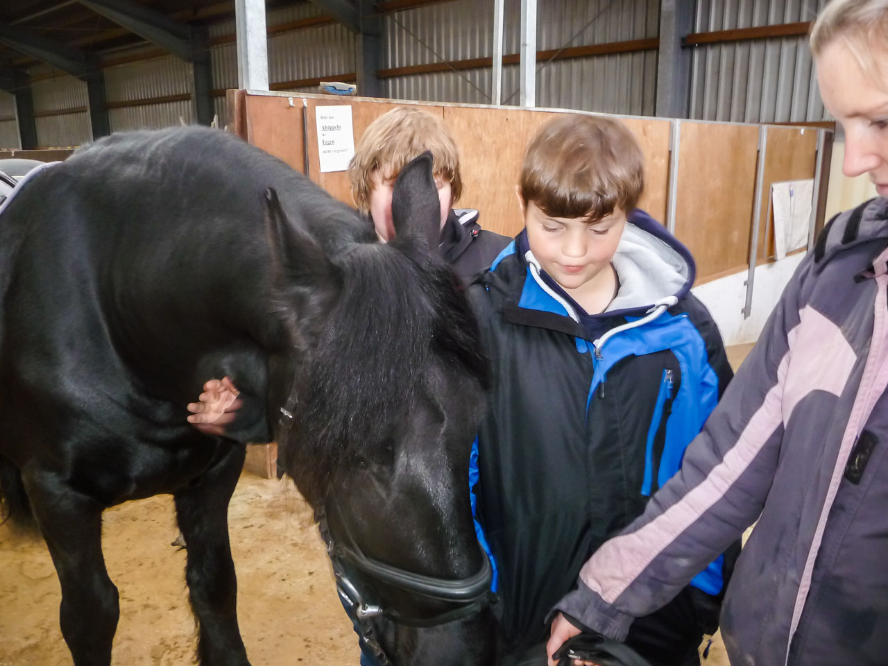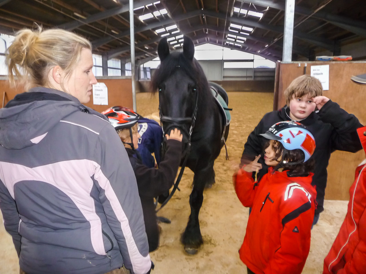 Der 10jährige Friesenwallach „Klaas“ war der Hauptakteur dieser Projektwoche. Zunächst lernten die Schülerinnen und Schüler, wie man den gutmütigen „Schwarzen“ richtig putzt. Nachdem das richtige Führen mit ihm geübt wurde, durften die Kinder erste Übungen an der Longe auf dem Friesen Klaas durchführen. Ob Schritt, Trab oder Galopp – am Ende der Projektwoche waren alle Kinder „sattelfest“ und richtig stolz auf ihre vollbrachte Leistung.