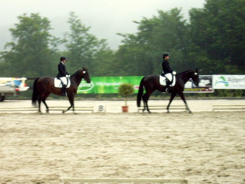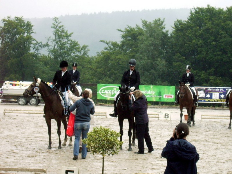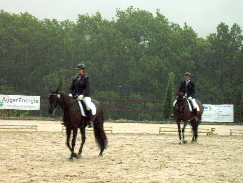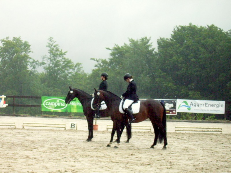 Im strömenden Regen ging Yvonne Häner mit ihrem Simply Black an den Start. Dem 6jährigen Wallach von Sir Savoy schien das Wetter überhaupt nichts auszumachen. Während er in seinen vergangenen Dressurprüfungen noch etwas „Grün hinter den Ohren“ wirkte, zeigte er sich hier völlig gelassen und erfahren. Und vollkommen verdient, erhielten die beiden eine Wertnote von 7,7 und wurden mit dem 3. Platz belohnt.